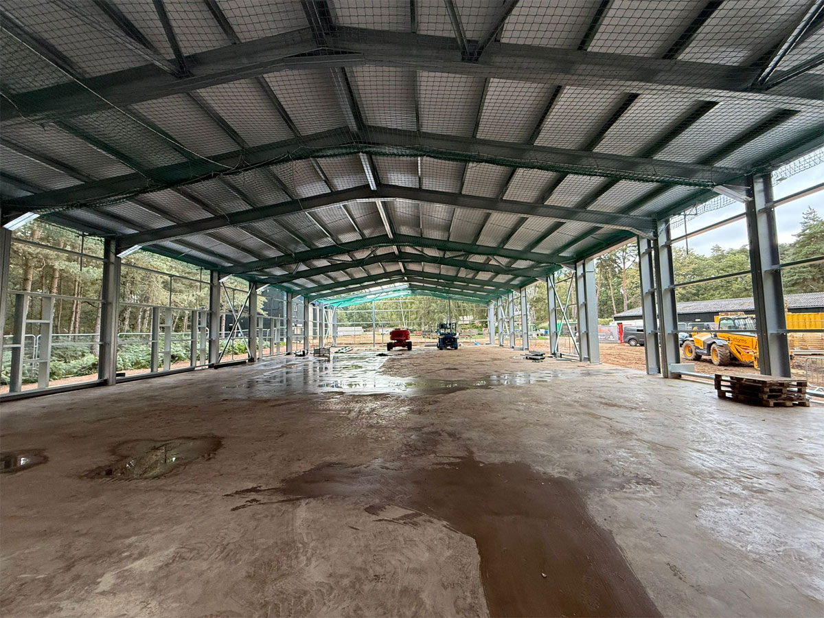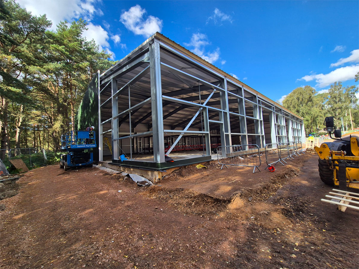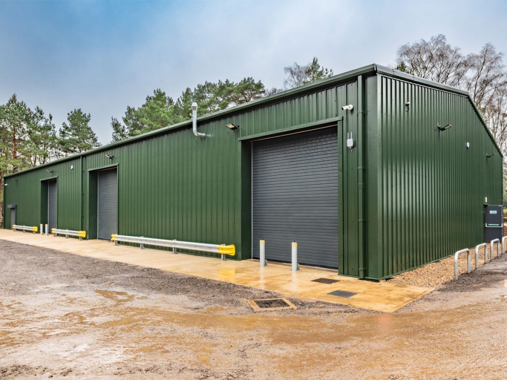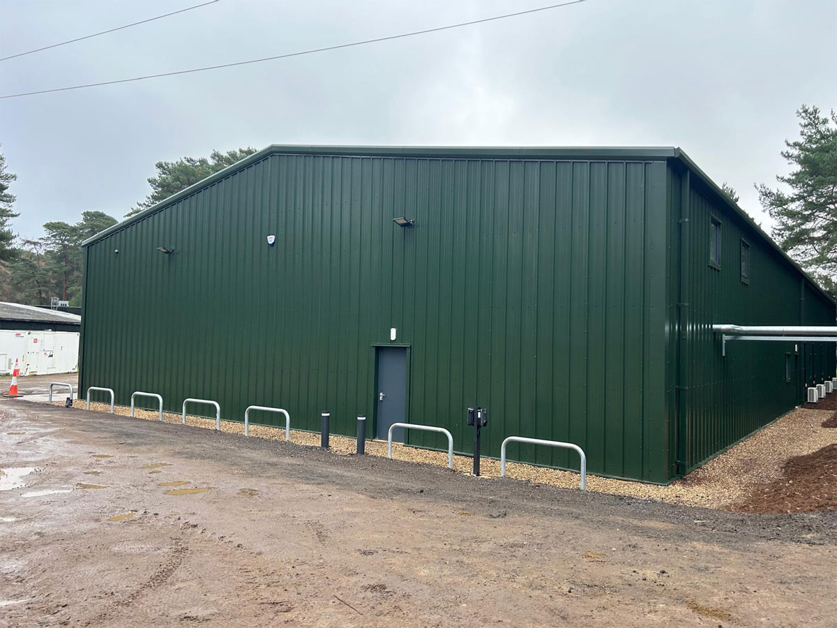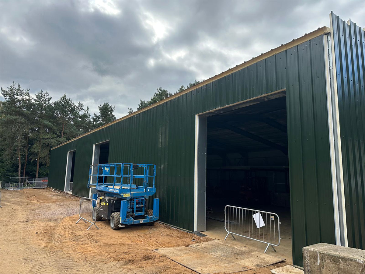 Working with the Course Manager, MD, the Woburn Estate property team and their architects, we designed the building using one of our bespoke cold rolled frames, and fully insulated Tata composite panels. British made high quality 3 phase industrial roller doors, windows, PA and fire escape doors, all with shutters completed the spec. The client wanted a turnkey solution, so we introduced a contractor to act as PC and look after groundworks, drainage, fit out and M&E.